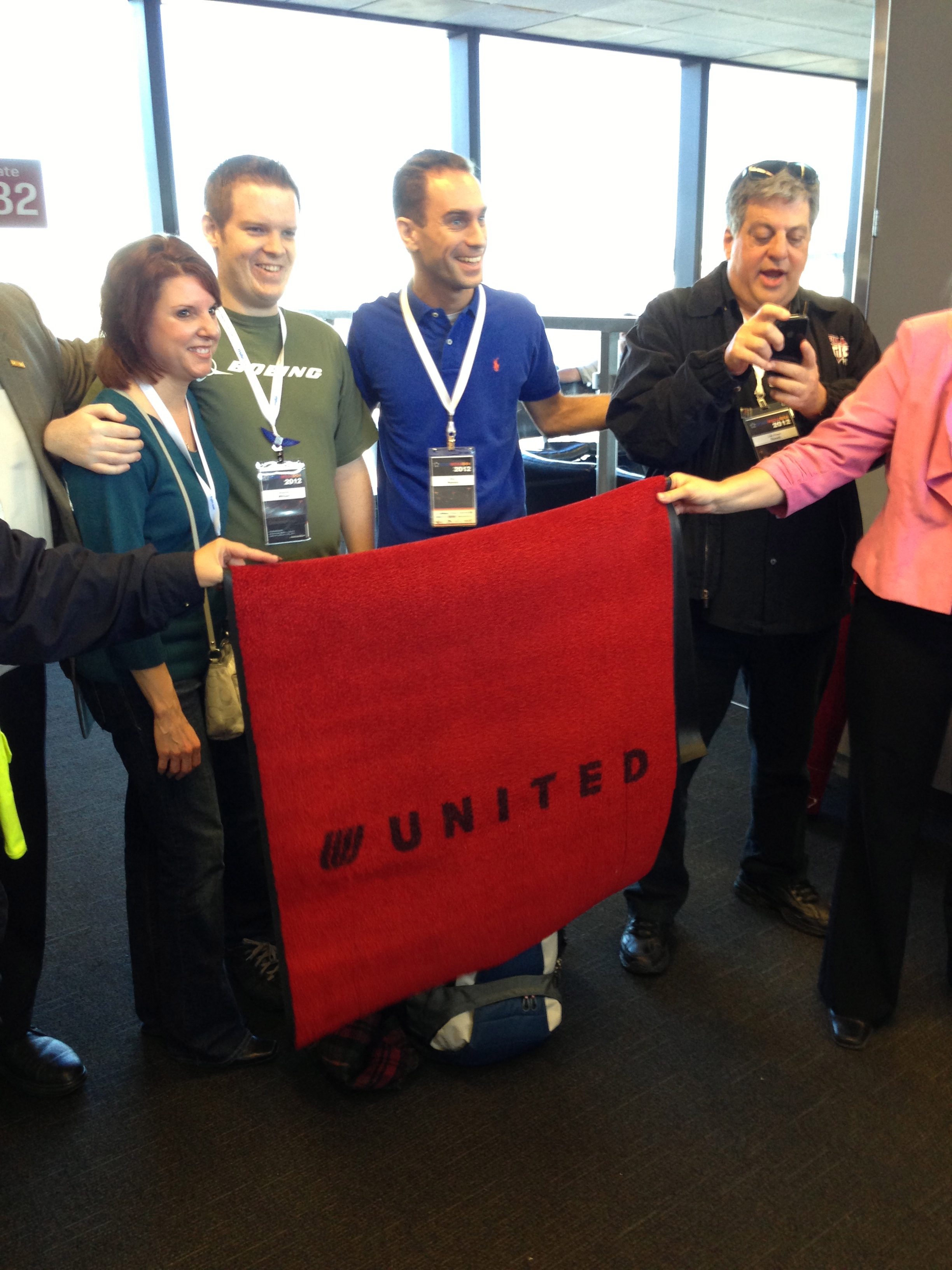 Fast forward to a crazy group of 200 frequent travelers packing the gate area getting ready to board a plane the majority had never been on before. Things got a bit crazy, as 3 of our attendees decided they wanted to buy used carpets with the old United Airlines logo on them. In the span of a couple minutes we had raised over $2K. A short time later, we were boarding our first leg to Houston.